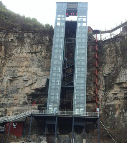 北京市房山區十渡龍湖灣景區鋼結構雙峰觀光電梯,運行高度68米,運行承重量1.6噸,承載人員23人,于2015年10月開工,2016年4月1日投入使用。